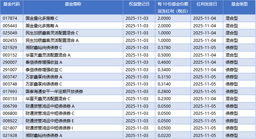 (1)11月03日新发基金共有48只,主要为混合型基金和股票型基金,其中易方达中证国资央企50ETF联接C募集目标金额达80.00亿元;基金分红17只,多为债券型,派发红利最多的基金是国金量化多策略灵活配置混合型证券投资基金,每10份基金份额派发红利2.0000元;
