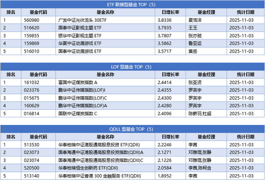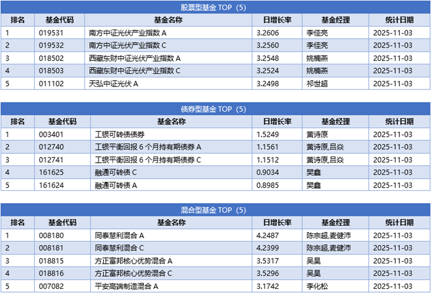 单基金方面,剔除掉 创新封基类型 基金的影响,11月03日业绩表现最好的基金为同泰慧利混合A,日增长率为4.2487%,其次为同泰慧利混合C,日增长率为4.2399%、广发中证光伏龙头30ETF,日增长率为3.8336%。