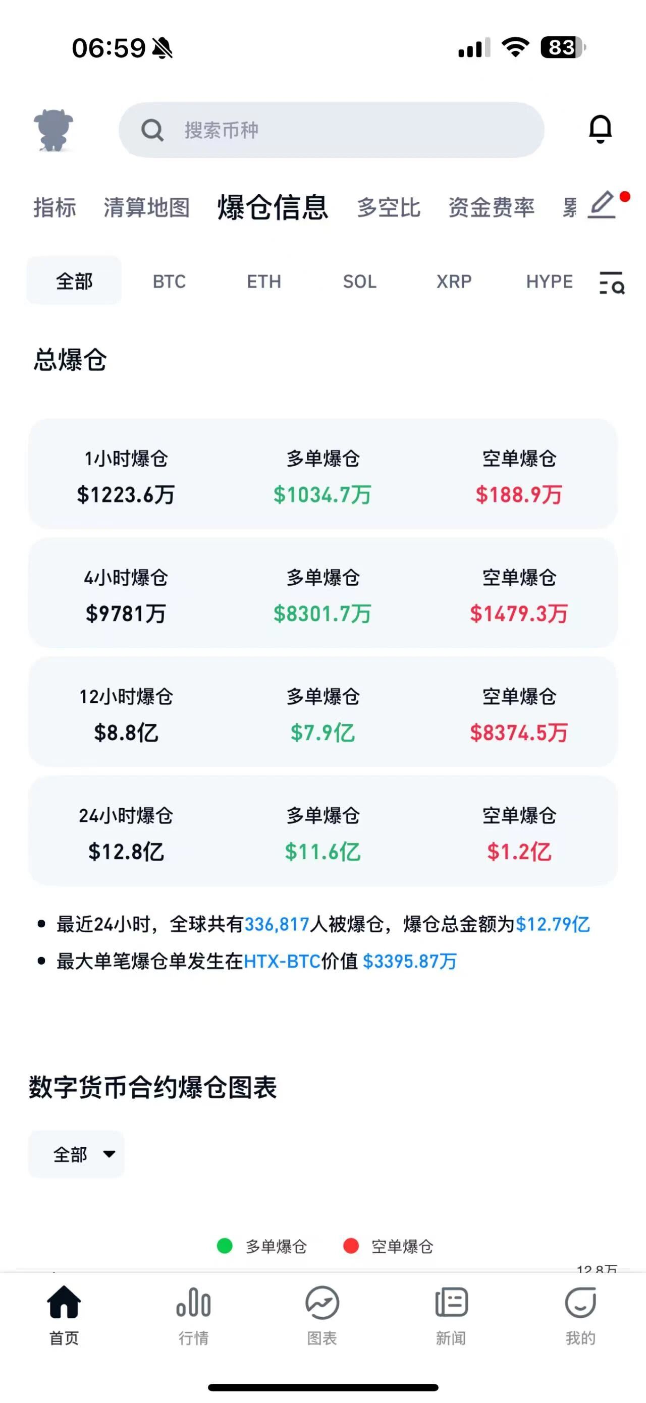 根据CoinGlass最新数据,过去24小时加密货币市场共有336817人爆仓,爆仓总金额为12.79亿美元。