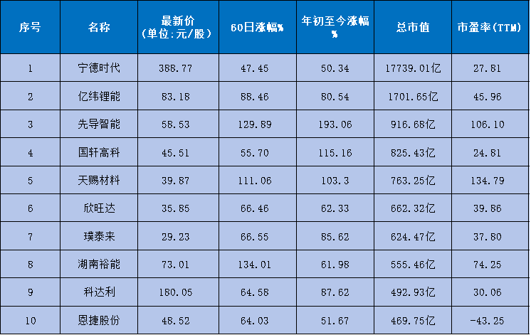业绩与技术的双重利好推动二级市场表现强劲。截至10月31日收盘,宁德时代以1.77万亿元市值保持绝对领先,亿纬锂能以1701.65亿元市值排名第二。年初至今,板块内103家企业股价实现正增长,仅3家出现负增长,其中20家企业涨幅超100%,宏工科技以426.32%的涨幅居首。短期来看,60日内97家企业股价上涨,仅9家下跌,天际股份以235.95%的涨幅领跑。