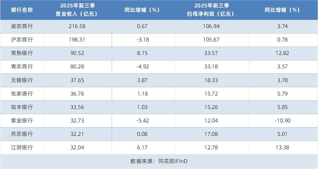 截至10月31日,A股上市农商行2025年前三季度的业绩数据已披露完毕。总体来看,呈现出“增长与承压并存”的显著分化格局。在已公布数据的10家银行中,有7家营业收入实现同比增长,9家归母净利润保持正增长。具体来看,部分头部银行如沪农商行、青农商行营收出现下滑,紫金银行营收与净利润“双降”,显示出在复杂的经营环境下,不同银行间的业绩表现正在拉开差距。