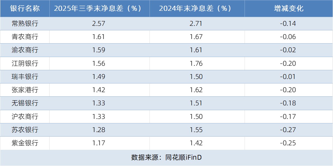 净息差收窄已成为整个银行业面临的共同挑战,上市农商行也未能独善其身。数据显示,2025年三季末,所列的10家农商行,净息差全部较上年末出现下滑。然而,在整体下行的大环境中,各家银行的承压程度却大相径庭。其中,苏农银行和紫金银行下降较多,分别达0.27和0.25个百分点;而瑞丰银行与渝农商行的降幅则相对温和,均未超过0.02个百分点,显示出其在应对息差收窄时具备了更强的韧性。