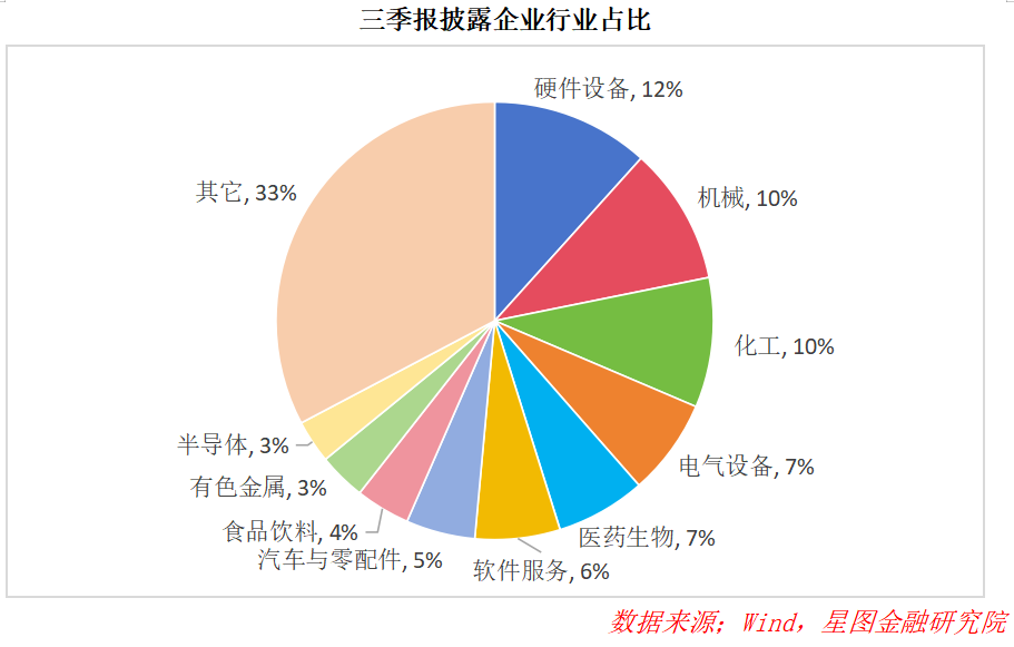 具体来看,从各行业披露三季报的企业家数来看,硬件设备、机械、化工行业披露三季报的企业家数最多,分别为498家、433家、409家,这些行业主要集中在制造业领域,这一分布情况也符合我国当前产业结构的特点。