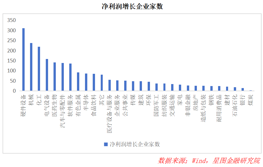 从行业维度来看,硬件设备板块实现利润增长的公司数量最多,达到311家,该板块企业主要集中在计算机、通信与电子设备制造等领域,行业景气度处于较高水平;机械与化工板块紧随其后,分别有238家和220家企业实现利润正增长;此外,电气设备、医药生物、汽车与零配件、软件服务等板块也均有100家以上企业实现利润增长。