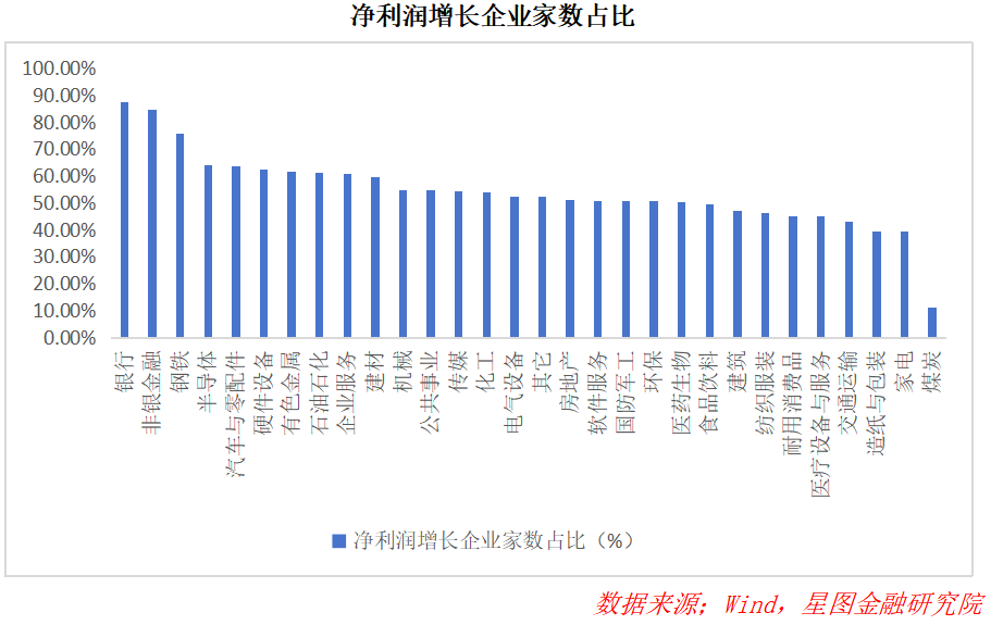另外,从各行业净利润增长企业家数占比情况来看,银行板块表现最为亮眼,有87.50%的企业实现净利润增长,业绩稳定性较强;其次是非银金融板块,有84.85%的企业实现净利润增长;钢铁、半导体、汽车与零配件、硬件设备、有色金属板块表现也同样突出,行业内利润同比增长的企业占比分别达到75.76%、63.97%、63.76%、62.45%与61.74%。