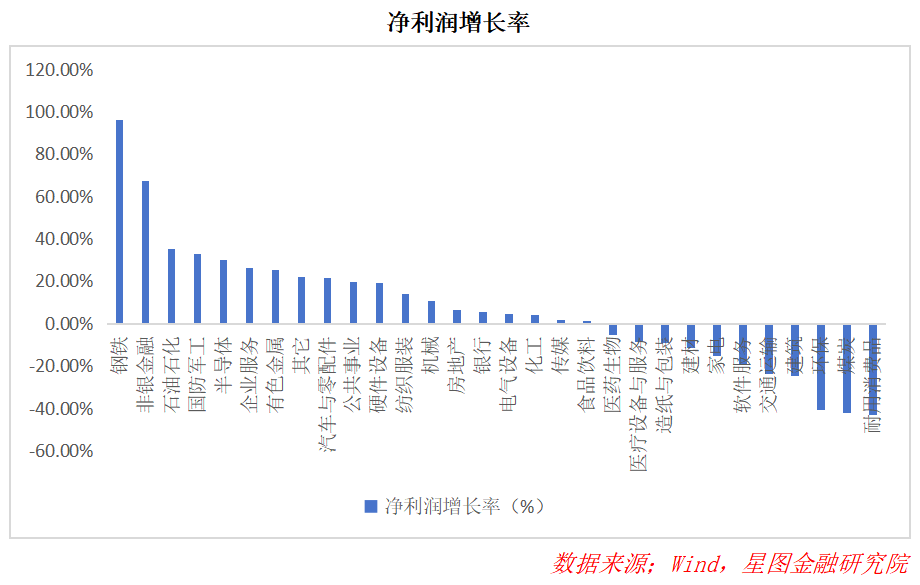 若从各行业净利润增长幅度来看,在剔除极值数据后,钢铁板块表现最为优异,企业平均净利润增长率达到96.06%;非银金融、石油石化、国防军工板块紧随其后,平均利润增长率分别为67.53%、35.17%与32.79%;同时,半导体、企业服务、有色金属、汽车与零配件、公共事业、硬件设备板块也均实现15%以上的净利润涨幅,展现出良好的盈利增长趋势。