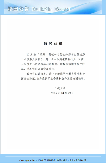 10月29日下午,三峡大学发布情况通报:,10月26日凌晨,我校一名男性外籍学生翻墙潜入本校某女生宿舍,对一名女生实施猥亵行为。目前,公安机关已依法将其刑事拘留,学校依据相关校纪校规,对其作出开除学籍处理。,我校将以此为鉴,进一步加强学生教育管理和校园安全防范,全力维护学生合法权益和正常校园秩序。,