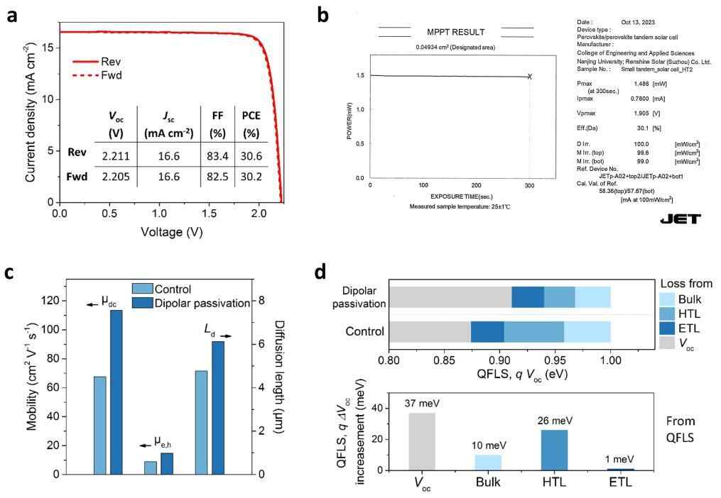 ,这是南京大学等单位研制的光电转化效率30.1%全钙钛矿叠层光伏电池。(受访者供图),据谭海仁介绍,钙钛矿光伏电池长期难以提升光电转化效率,主要难在无法精确探测和调控钙钛矿材料中的载流子。,而常超团队开发的非接触式、无损太赫兹辐射探测光谱表征技术,通过数十次实验有效解决了这一难题。太赫兹光子具有亚带隙能量特性,能够特异性地探测钙钛矿中自由载流子浓度,不会引发带间跃迁干扰。同时,太赫兹场振荡与载流子动量弛豫的皮秒级同步特性,为研究载流子输运行为提供了独特的时间分辨能力。,此次研究中科研人员发现,钙钛矿吸光层和空穴传输层之间的界面,是载流子损耗较多的区域。团队为此设计出一种偶极钝化层,它就像城市里的单行道,一头连着钙钛矿吸光层,一头连着空穴传输层,驱使载流子向空穴传输层运动。,太赫兹辐射探测诊断结果清晰揭示了偶极钝化策略在促进电荷传输、抑制损耗等方面的微观机制。实验数据显示,经钝化处理的钙钛矿薄膜,总载流子迁移率提升68%以上,载流子扩散长度延长近30%。,