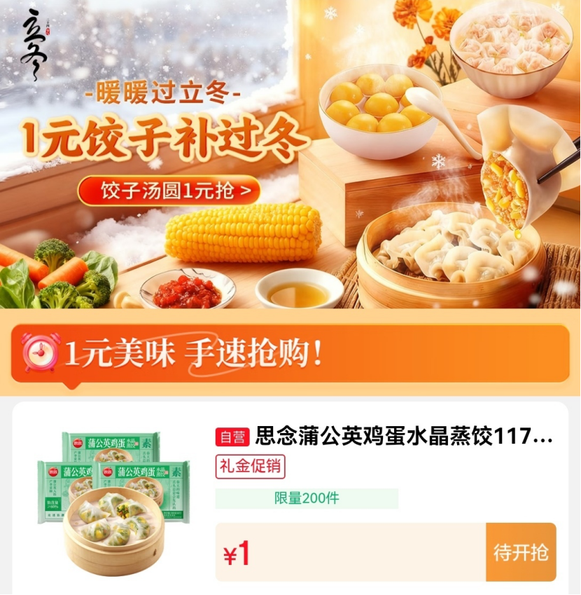 今年立冬,自11月6日起,京东精选出17款爆款美食,开启1元抢购。其中,既有立冬必吃的水饺,如蒲花岛纯手工槐花鸡蛋水饺、思念纸皮蒸饺、蒲公英鸡蛋水晶蒸饺等,也有传统中式点心,包括思念小黄鸭汤圆、皇家小虎老面小笼包等。此外,京东还甄选了多款营养便捷的儿童早餐,包括小黄象黑椒牛肉意面、思念蛋仔派对红豆包、思念黑米糕小米糕等,为忙碌的上班族、有儿童的家庭提供高品质的冬季美食。