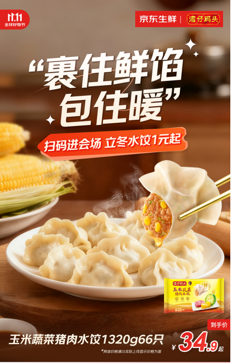 这其中,今年最受消费者喜爱的明星单品湾仔码头系列水饺,包含玉米蔬菜猪肉、大白菜猪肉等多种口味,食材甄选自肥而不腻的猪前腿肉和新鲜爽嫩的青菜,不仅皮薄馅足,鲜香脆甜,蒸煮也方便。今年,京东还独家定制开发了超大容量的1800g系列,总共90只,以满足家庭囤货的需求,京东11.11期间,这款水饺销量突破250万,也是水饺品类中的TOP1单品。