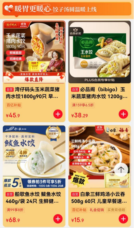 不仅如此,立冬期间,京东上的上千款水饺、汤圆等美食,叠加优惠券后低至4折,让消费者以最实惠的价格买到心仪的美味。