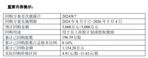 根据公告,截至2025年10月31日,均普智能通过上海证券交易所交易系统累计回购股份196.59万股,占公司总股本12.28亿股的0.16%。此次回购成交价格区间为4.91元/股至11.42元/股,累计支付资金1154.20万元(不含交易佣金等费用),符合相关法律法规及回购方案要求。公告明确,此次回购的股份将用于员工持股计划或股权激励。
