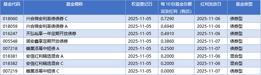 (1)11月05日新发基金共有6只,主要为混合型基金和基金中的基金(FOF)基金,其中鑫元港股通领航混合A募集目标金额达30.00亿元;基金分红8只,多为债券型,派发红利最多的基金是兴合锦安利率债债券型证券投资基金,每10份基金份额派发红利0.7290元。