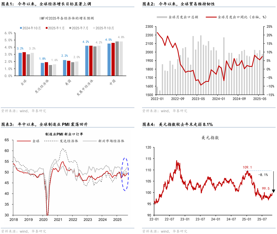 全球金融条件宽松+油价下跌提升相对购买力等推动全球贸易增长超预期,且美国实际关税税率上升幅度低于市场预期,对全球贸易的冲击相对可控。今年以来,全球宽财政叠加宽货币环境推动全球经济增长超预期,7月IMF对2025年全球经济增速预测定为3.0 %,最新10月的预测上调至3.2%(图表1);与此同时,前6个月全球贸易增长达5.2%(图表2);全球制造业PMI也震荡回升至荣枯线上方(图表3)。全球经贸超预期增长的背景,金融条件宽松降低融资约束、财政扩张直接拉动需求、油价下跌释放购买力形成“三重支撑”,具体来看: