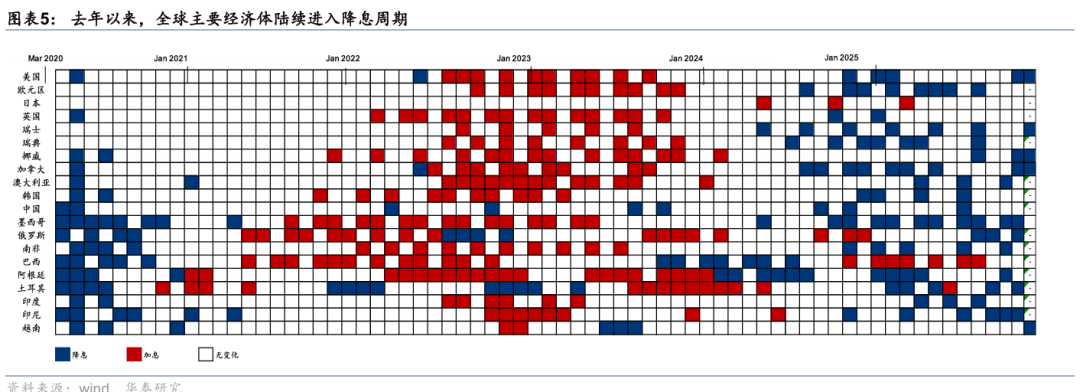 宽货币和美元贬值推动全球金融条件宽松。特朗普就任以来,对内破坏美国内部制衡、威胁联储独立性、推动财政扩张,对外实施关税摩擦、破坏盟友信任、并退出多个多边机构,动摇了全球对美国资产信心,加快美元地位的下降,导致4月2日对等关税加征后,美元指数应声走弱;截至 10 月 31 日,年内美元指数累计跌幅达 8.1%(图表4)。自去年起全球主要央行陆续开启降息周期,欧央行累计降息 8 次,存款便利利率降至 2%;美联储累计降息 5 次,联邦基金利率目标区间下调至 3.75%-4%(图表5)。全球央行普遍降息叠加美元走弱的背景下,全球金融条件宽松,今年以来高盛美国、欧洲金融条件指数均显著下降(图表6)