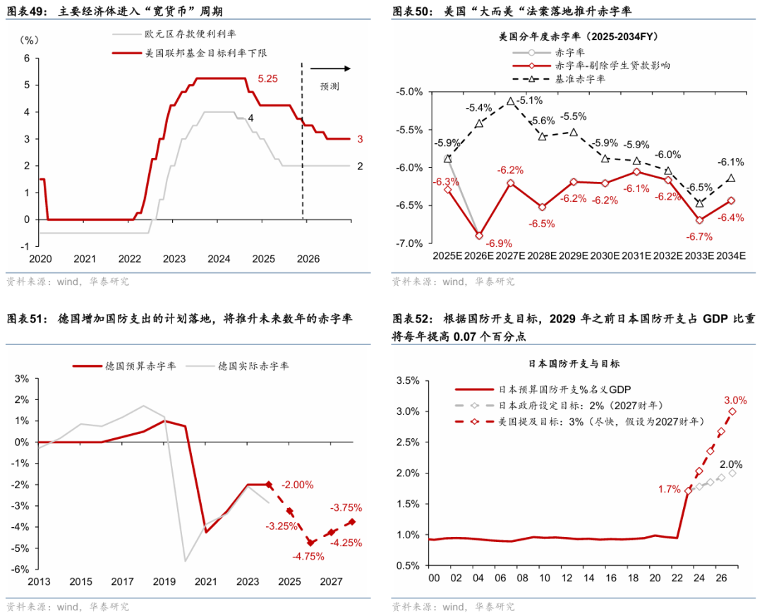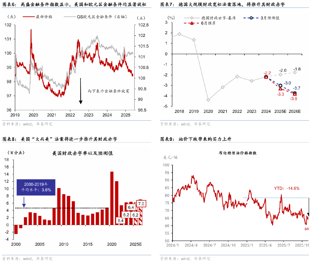 全球主要经济体已开启新一轮财政宽松周期,为全球经济复苏提供阶段性支撑。德国3 月打破长期财政保守主义传统,推出了大规模财政扩张计划,包括成立5000亿欧元基建专项基金(占2024年GDP的12%)、超过1%的国防支出将被债务刹车豁免、以及债务刹车中各州结构性赤字从0%上调至GDP的0.35%(图表7,参见【华泰宏观|专题】德国财政“不惜一切代价”时刻?,2025/3/12)。美国7 月“大而美”法案正式落地,核心内容包括永久化企业与个人减税措施、豁免小费及加班工资税收等,同时授权数千亿美元国防与移民相关支出,也将推升财政赤字(图表8,参见【华泰宏观|专题】参议院版本的“大而美”法案进一步推升美国财政赤字,2025/7/1)