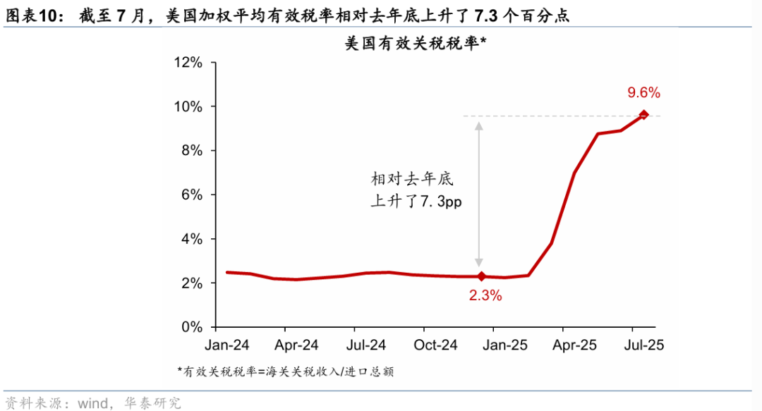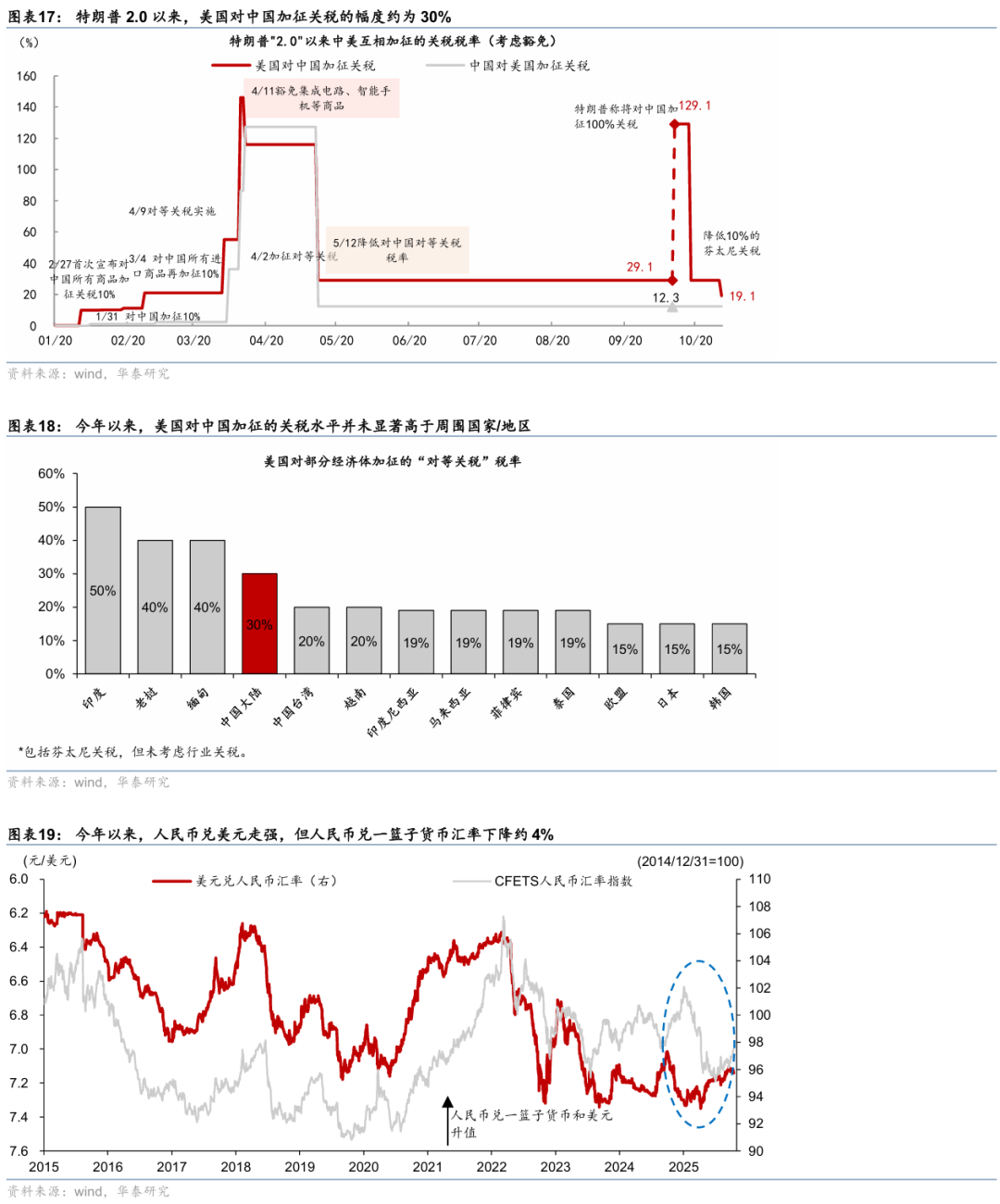 本轮美国对中国加征关税的幅度相对可控。2025 年 4 月中美关税短暂升级后,双方于 5 月通过日内瓦会谈达成阶段性缓和,美国对中国商品暂停实施 24% 的高额关税,保留 10% 的基础税率以及此前的芬太尼关税20%,并取消了后续追加的部分关税条目。即便 10月10日,美国宣布将对所有从中国进口的商品加征额外100%的关税,但该计划于10月26日被放弃。此外,10月30日,商务部新闻发言人表示,美方将取消针对中国商品加征的10%所谓“芬太尼关税”。同时,今年以来对中国加征的关税幅度并没有显著高于包括东盟、欧盟和日本在内的经济体和主要贸易国。而欧盟、日本等主要贸易伙伴同样需应对美国在钢铁、汽车等领域的针对性关税(参见【华泰宏观】美中关税降级的缘起、影响和后续,2025/5/13)。