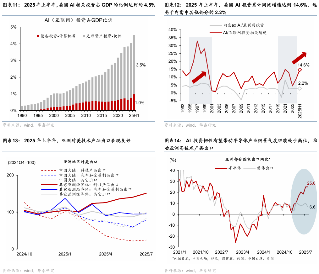 全球AI投资加速推动半导体产业链快速扩张,亚洲产业链尤为受益。今年以来,尽管面临美国的关税冲击,亚洲除中国外的地区对美科技产品出口继续增长,亚洲半导体出口增速显著高于整体,估算1-8月半导体产业链对亚洲出口的提振高达2个百分点左右。