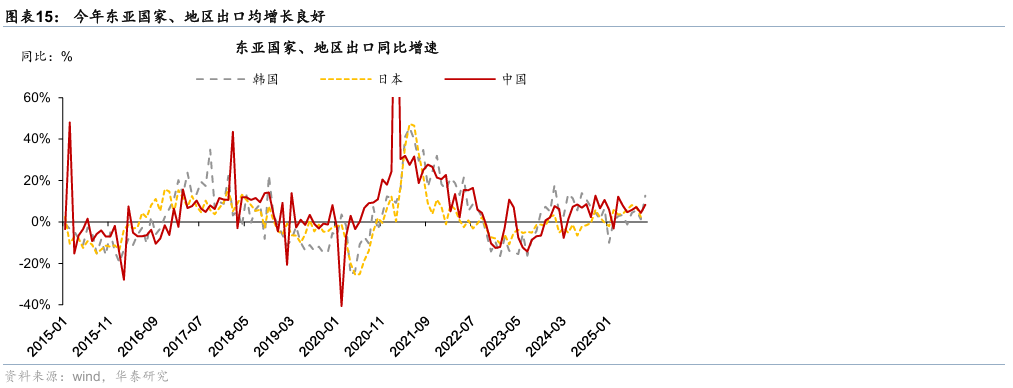 全球AI投资周期的加速亦推高整体亚洲出口的增速,今年1-9月韩国半导体出口录得16.9%,1-8月日本半导体出口增速亦回升至14.3%,1-9月中国台湾集成电路出口录得15.9%的高增速,中国大陆的集成电路出口亦回升至23.3%、对总出口同比增速贡献约1个百分点(图表16)。
