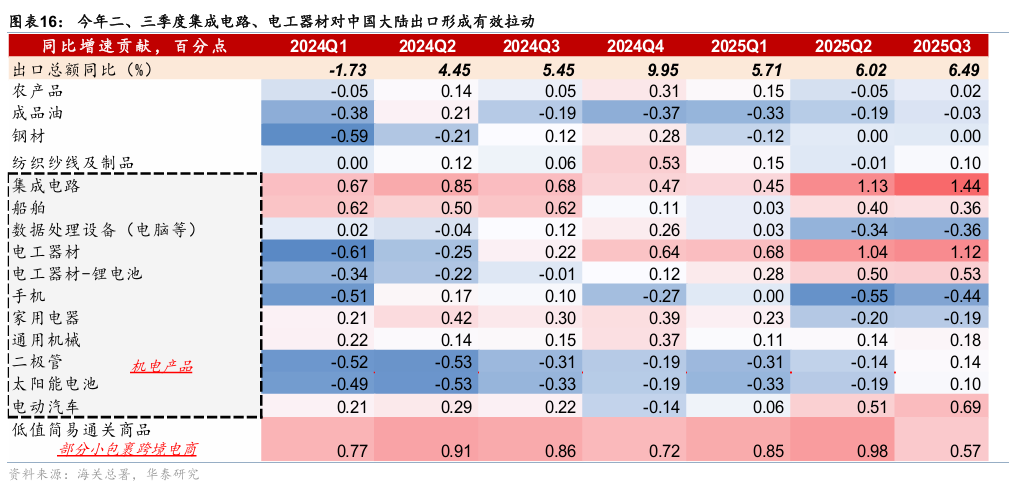 全球AI投资加速推动半导体产业链快速扩张,亚洲产业链尤为受益。今年1-9月中国大陆集成电路出口同比录得23.3%、对总出口同比贡献约1个百分点。估算1-8月半导体产业链对亚洲出口的提振高达2个百分点左右。