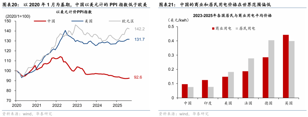 对中国而言,汇率走弱与PPI下行共同强化了中国的出口竞争力。从汇率角度看,在美元整体走弱的背景下,今年人民币兑一篮子货币汇率累计走弱约4%,其中相对欧元的走弱幅度更是接近10个百分点,人民币走弱亦边际提升中国商品的价格吸引力。此外,从工业品价格来看,中国的生产成本优势依旧突出——以2020年1月为基期,截至今年9月,中国以美元计价的PPI指数显著低于美欧,叠加偏低的能源价格,使得中国制造业在全球范围内具备成本洼地效应。2023年以来,中国商业与居民用电平均价格均处于世界较低水平,其中商业用电价格仅约0.096美元/千瓦时(kWh),为出口型工业产品提供了稳定的成本支撑。