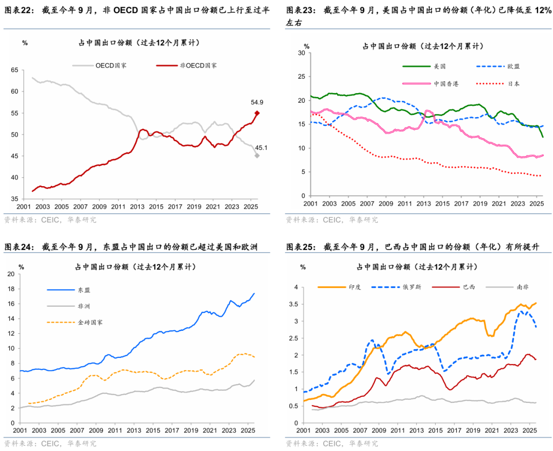 从地域分布来看,中国出口正呈现出明显的多元化趋势,东盟、非洲和中东等新兴市场的份额上升较快,各区域的出口产品结构各具特色,使整体出口链条展现出较强的“反脆弱性”。今年1—9月中国对美国出口同比下降16.8%,拖累出口增速约2.4个百分点;但新兴市场形成有效对冲,东盟(贡献增速2.4个百分点)、非洲(1.4个百分点)成为主要拉动力。在东盟内部,中国对越南出口尤为突出,同比增长22.2%,单一国家便贡献了1.0个百分点的出口增速。此外,自2023年5月起,中国出口的目的地重心持续向非OECD国家转移。