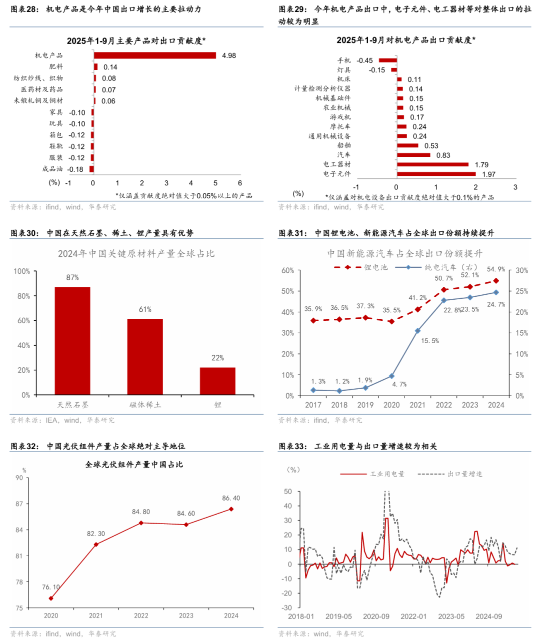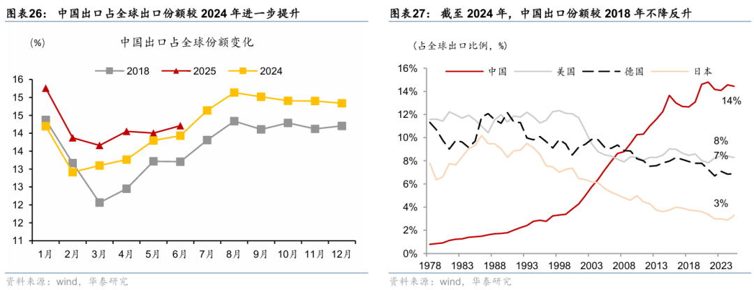 中国制造业产业链的持续升级显著增强了中国出口产品的竞争力,中国“新三样”(电动载人汽车、锂电池和太阳能电池)出口占全球的份额亦进一步提升,今年1-9月电气设备、汽车贸易顺差同比增长15%/28%,且在全球关键矿产供应链中占据着核心且不可替代的地位,从而有效降低了对关税变化的敏感度。截至今年6月,中国出口占全球的份额进一步上行,亦显示出中国出口竞争力的不断提升(图表27)。