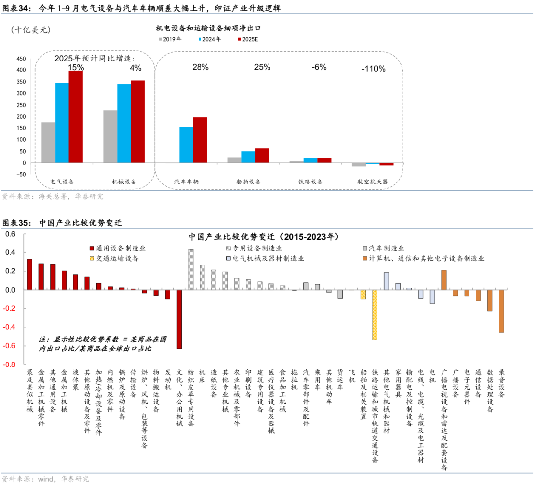 从产品结构上看,今年1-9月机电产品出口额同比增长8.4%,对出口增速的贡献从去年同期的2.8个百分点上行至5.0个百分点,成为中国出口的结构性亮点。从顺差角度来看,今年1-9月贸易顺差同比增长27%,其中电气设备的贸易顺差同比增长15%,运输设备顺差从2019年的145亿美元大幅上升至2024年的2176亿美元,占总顺差比例从2019年1%预计提升至2025年1-9月的13%。其中汽车车辆净出口增长突出,从2019年逆差8.2亿美元预计转为2025年顺差1970亿美元,2025年1-9月同比增长28%,显示出中国在汽车产业链竞争力显著提升。