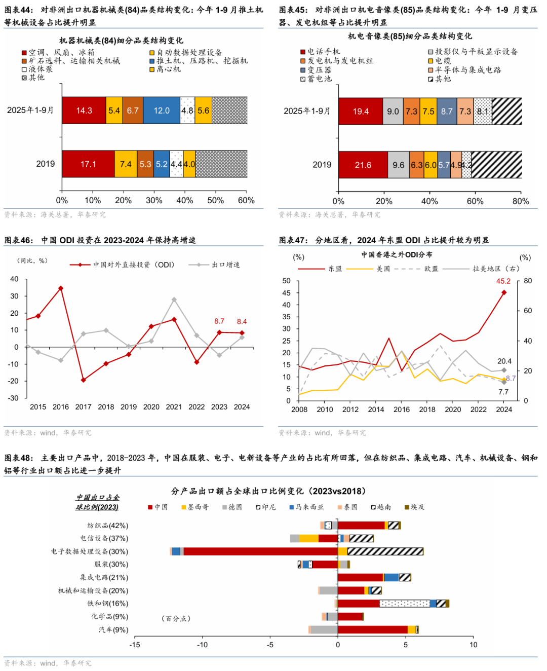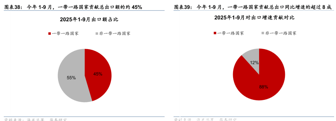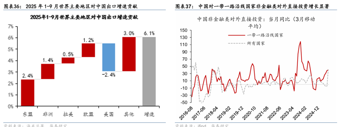 中国与“一带一路”和全球南方国家合作持续深化,企业出海亦为出口增长提供结构性支撑。今年1–9月中国对“一带一路”国家投资(OFDI)同比增长25.1%,投资带动对非出口增长27.9%,矿产勘探、电力物流等需求释放,带动中国机械设备、车辆与船舶等资本品出口快速增长。
