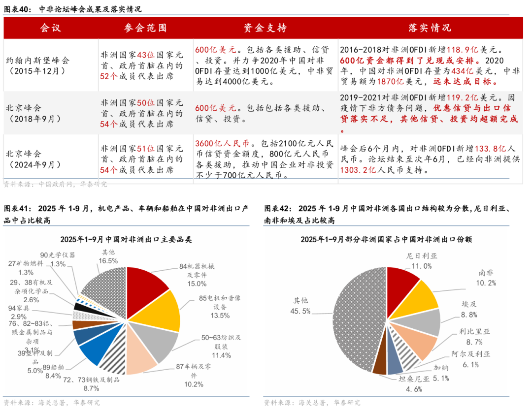 中国与“一带一路”及全球南方国家的合作持续深化,加速的对外直接投资(OFDI)正为出口增长提供结构性支撑。尤其是去年中非合作论坛红利不断释放,对非投资扩张推动出口维持高增长。2025年1–9月,中国OFDI同比增长4.0%,其中对“一带一路”沿线国家投资同比大增25.1%,且一带一路国家出口对今年1-9月出口同比增速的贡献接近9成。2024年9月的中非合作论坛上,中国宣布未来三年将向非洲提供3600亿元人民币的投资支持,包括提供2100亿元人民币信贷资金额度和800亿元人民币各类援助、推动中国企业对非投资不少于700亿元人民币。大量政策性资金投入加速当地交通、能源与物流基础设施建设。