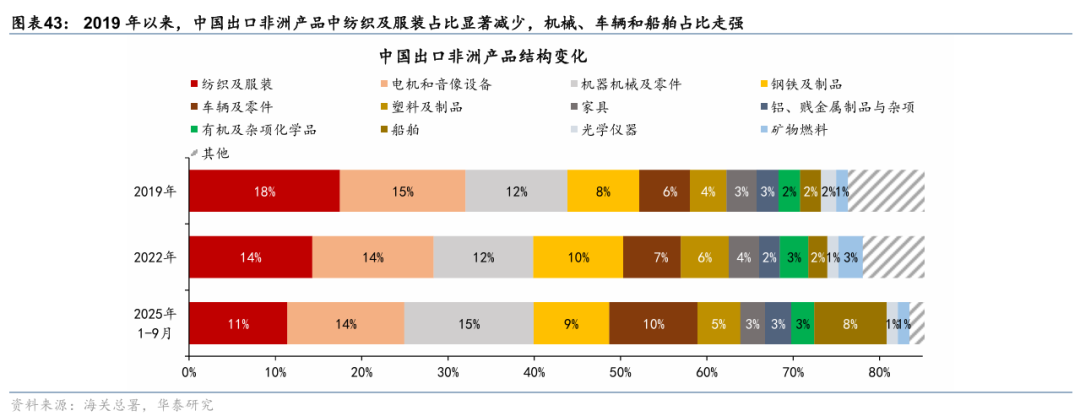 从品类看,中国对非出口结构出现资本品占比提升的特征——2025年1-9月,机电产品出口占比接近30%,车辆与船舶合计超15%。相比之下,2019年出口以纺织、化工、金属制品等中低端消费品为主;汽车类与机器机械类产品占比分别从2019年的5.8%与11.8%提升至2024年的10.2%与15.0%,而同期纺织及服装类占比则由17.5%降至11.4%。