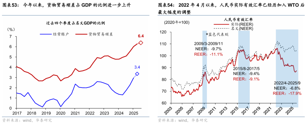 此外,考虑到今年以来中国出口在关税冲击下仍实现超预期增长,真实有效汇率竞争力上升,为人民币进一步升值提供动能。今年以来,面对美国加征关税的压力,中国出口仍持续超预期,带动贸易顺差累计同比增长26%、占GDP的比例持续上升(图表54;参见【华泰宏观】人民币升值逐渐走出“独立行情”,202510/29),显示中国出口竞争力持续增强。与此同时,人民币真实汇率已经通过低通胀进行了充分的调整,竞争力持续凸显。2022年4月以来人民币名义有效汇率已累计回调6.8%,同时国内低通胀则进一步带动真实有效汇率调整,人民币实际有效汇率累计调整17.9%,为中国加入WTO后最大单次回调幅度(图表55;参见【华泰宏观】人民币升值逐渐走出“独立行情”,202510/29)。近年来中国制造业的成本控制与生产效率优势全方位加速提升,真实有效汇率竞争力上升,有望推动人民币升值走出“独立行情”。
