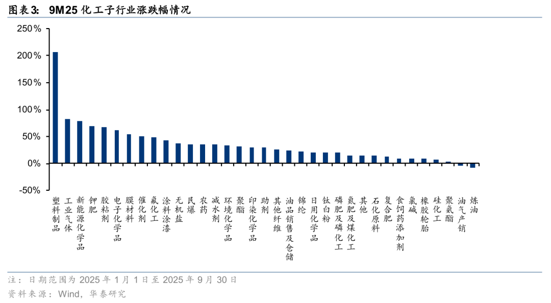 在地缘局势反复、OPEC+增产、美国贸易政策不确定性等多重因素下,9M25原油价格中枢整体震荡下行,化工行业整体成本端有所改善。需求方面,地产需求仍偏弱,但政策支持下汽车、家电等产品需求增速较好,且电子、新能源、军工等需求亦有回升;供给方面,行业资本开支已进入下行通道,伴随前期增量产能消化,大宗化工供需拐点或逐步临近,部分资源品和格局较好子行业的复苏态势初现。9M25华泰化工组分类的35个子行业中,33个子行业A股表现上涨,其中涨幅居前为塑料制品/工业气体/新能源化学品/钾肥/胶粘剂等(涨幅207%/82%/79%/69%/67%);2个子行业A股表现呈现跌势,炼油/油气产销板块跌幅居前。