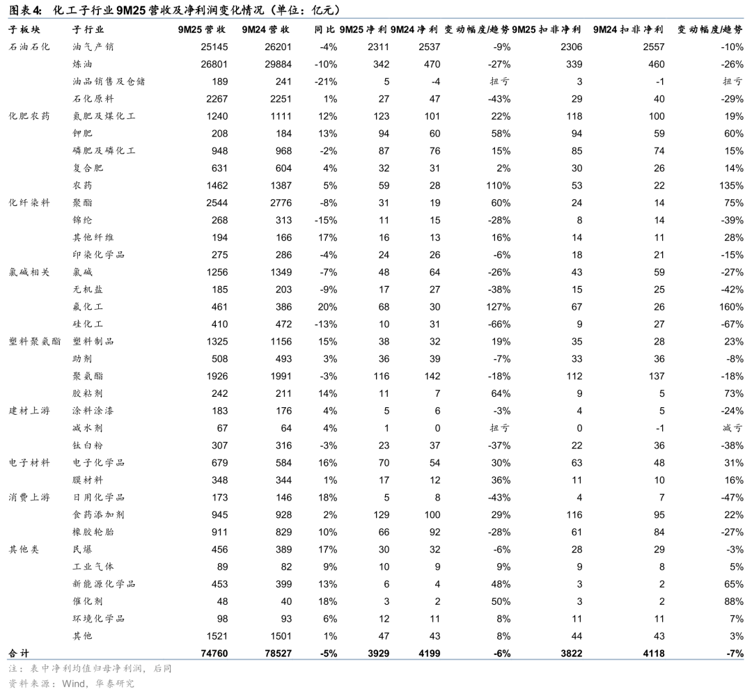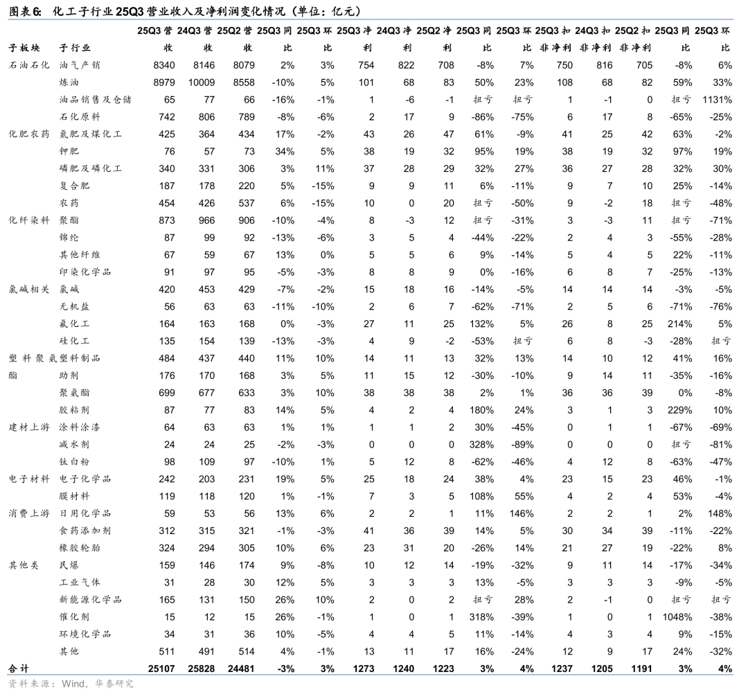 据我们统计,9M25基础化工&石油天然气板块(根据华泰化工组分类)505家上市企业实现营收74760亿元,同比-5%;归母净利润3929亿元,同比-6%;扣非净利润3822亿元,同比-7%;净利率5.26%,同比-0.09pct;扣非净利率5.11%,同比-0.13pct。25Q3营收25107亿元,同比-3%/环比+3%;归母净利润1273亿元,同比+3%/环比+4%;扣非净利润1237亿元,同比+3%/环比+4%;净利率5.07%,同比+0.27pct/环比+0.07pct;扣非净利率4.93%,同比+0.26pct/环比+0.06pct。