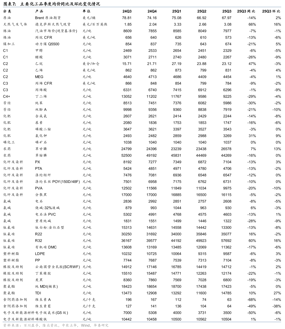 结合主要产品价格来看,多数化工品价格同环比均有回落。25年以来,全球成品油需求预期下降、主要产油国增产影响下原油价格中枢同比下滑;化肥农药方面,海外钾肥供给扰动致价格上升,草甘膦海外补库需求回升支撑价格回暖,其余多数品种受成本支撑不足致价格下行;PX、PTA和涤纶等受油价下行影响,价格同比走弱;氯碱、钛白粉、硅产品价格多数延续弱势;三代制冷剂在供需双利好下价格上涨较快;塑料、橡胶部分产品受供需双弱影响下同环比有所下行;聚氨酯原料受供给减量支撑价格上升;食饲药添加剂供给端竞争加剧,价格同环比下降;电子化学品在产能扩张影响下多数品种价格走弱。