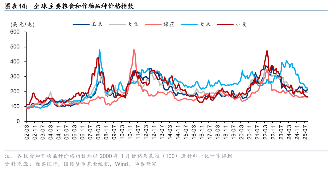 化工行业总体需求依赖宏观环境,据国家统计局,9月国内PMI指数为49.0,终端需求整体仍需等待复苏。房屋新开工/竣工/销售等指标底部企稳,家电产量、汽车销量等数据保持增长态势,全球主要粮食作物价格延续走弱。我们认为,伴随行业资本开支增速逐渐下降,叠加内需有望复苏及出口亚非拉等支撑需求,大宗化工品有望于2026年逐步迈入景气周期。