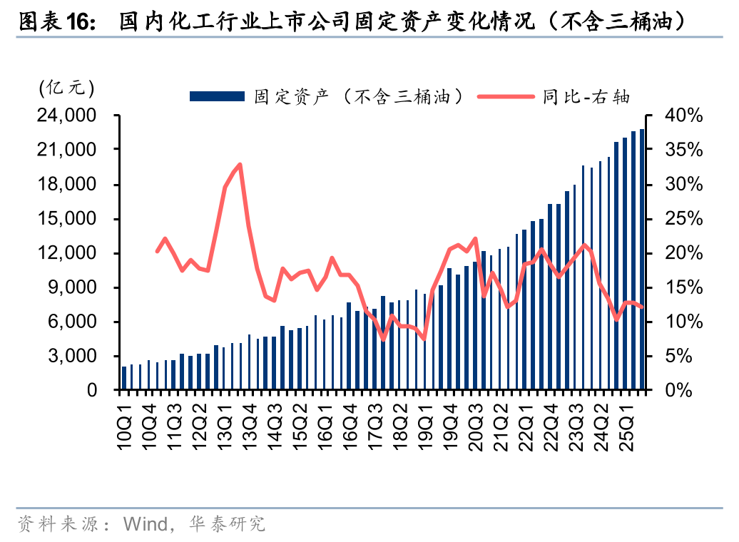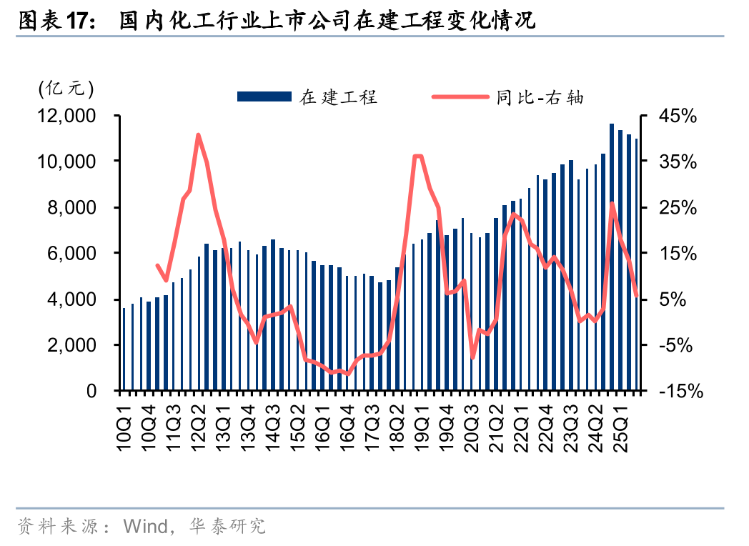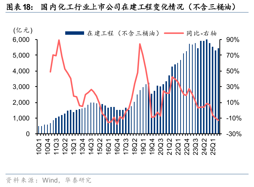 供给端角度,由于行业盈利空间下滑,化工行业固定资产投资同比增速已有所放缓。25Q3末纳入我们统计的502家化工上市企业(不含“三桶油”)在建工程余额为5442亿元,同比减少13%,环比增长2.7%。阶段性而言,供给端新增产能增速已逐步放缓,行业资本开支回落下2026年有望迎来复苏拐点。
