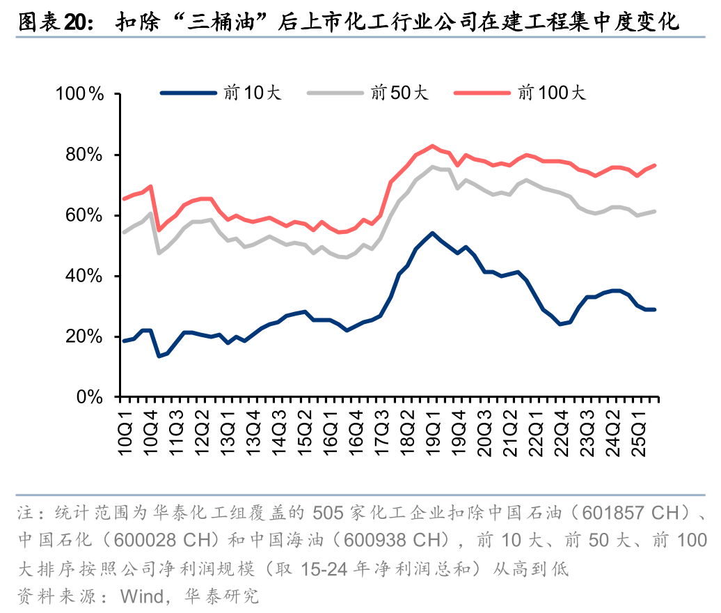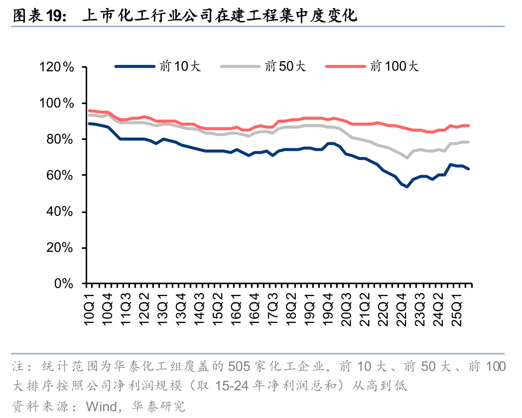 在统计的505家A股化工上市企业中,前10大、前50大和前100大企业在建工程占比较高且相对稳定;若扣除“三桶油”,25Q3前10大企业在建工程占比较16年末提升5pct至29%,前50大企业在建工程占比较2016年末提升14pct至61%,前100大企业在建工程占比集中度至76%,较16年末提升21pct。21-22年行业资本开支提速,23年以来行业前10大、前50大和前100大企业在建工程占比提升,龙头企业在能耗、成本控制和技术先进性、环保性等方面占据一定优势,行业新增产能仍有望进一步向龙头企业集中。