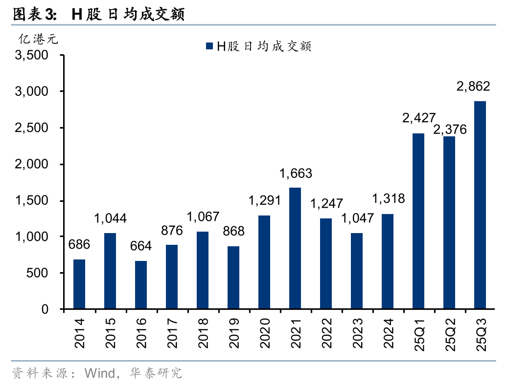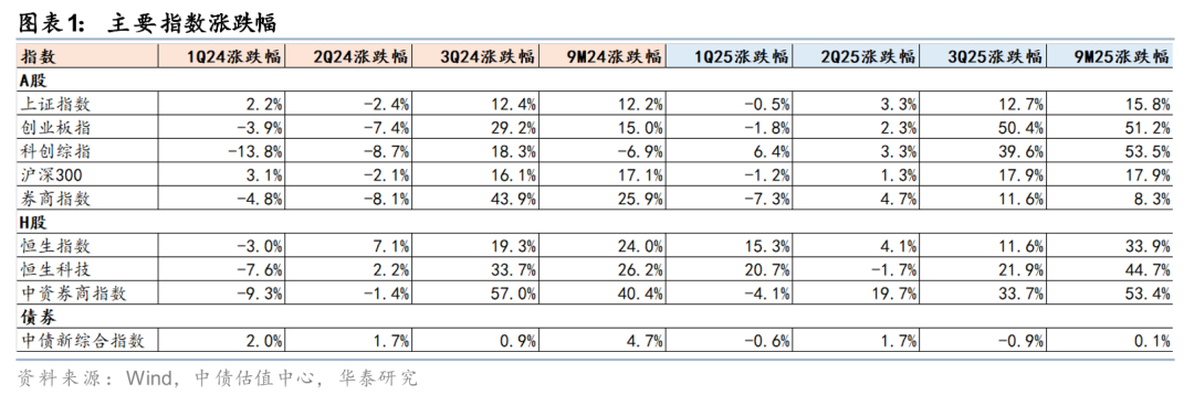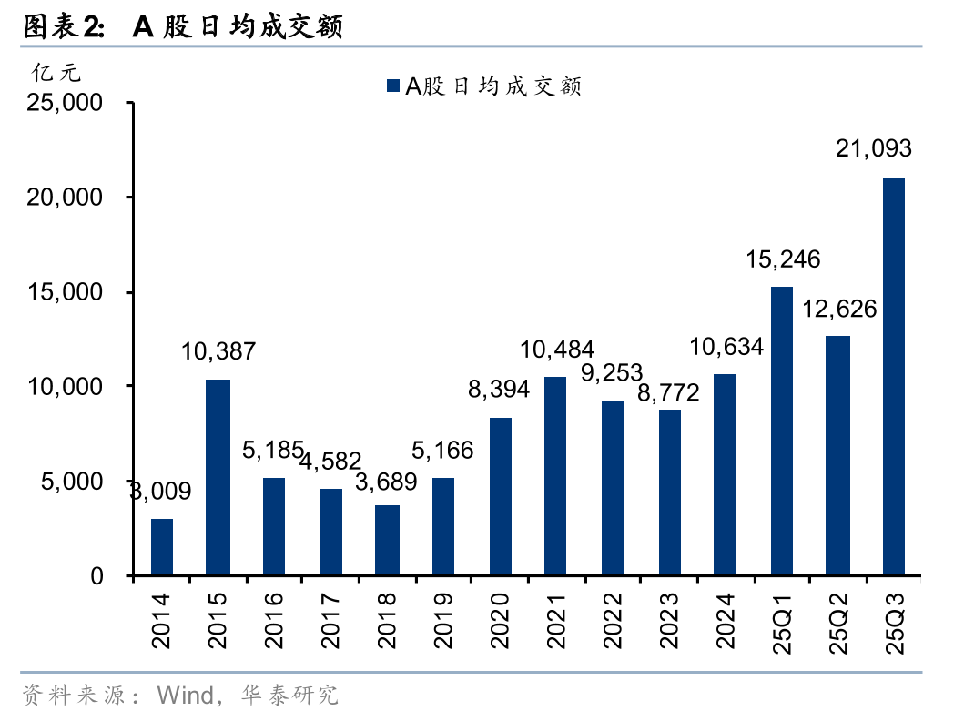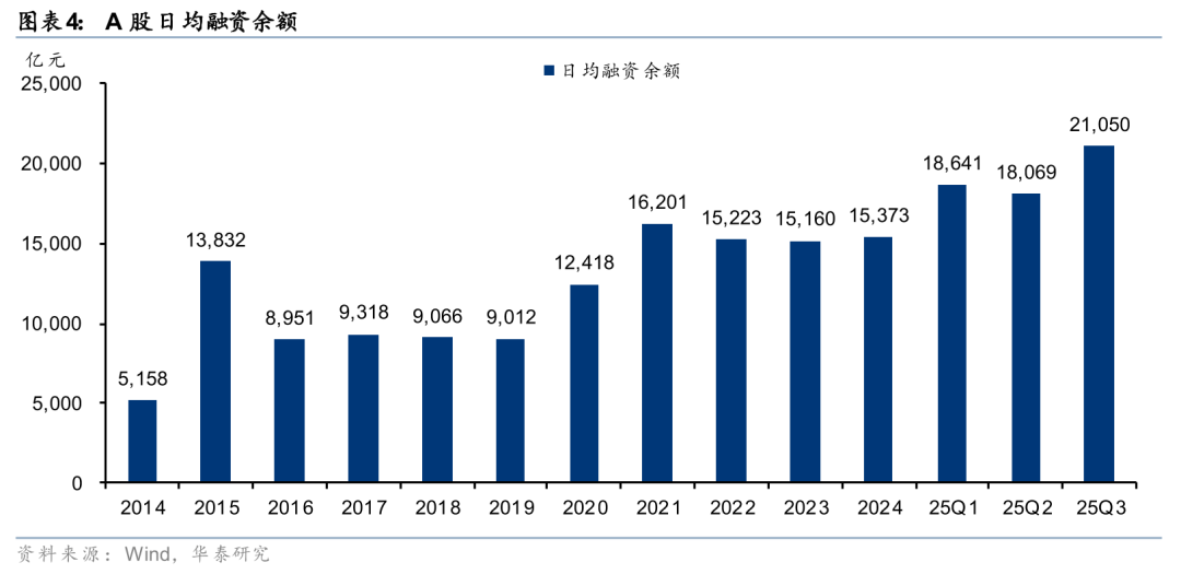 权益市场趋势向上,成交、两融高位运行。年初以来权益市场景气度持续提升,前三季度上证、恒指、恒生科技累计上涨15.8%、33.9%、44.7%。市场热度提升驱动股票交易活跃,2025年前三季度日均成交额为16496亿元,同比+107%,创历史年度日均新高。25Q3 A股日均成交额超2万亿,较24Q3增长211%。杠杆资金持续入市,A股融资余额连创历史新高,2025年前三季度日均余额19,322亿元,同比+32%;25Q3单季度日均余额21,050亿元,同比+50%。同时,港股成交活跃度进一步抬升,2025年前三季度日均成交额2,563亿港元,同比增长52%;25Q3日均成交额2862亿港元,较24Q3增长141%。