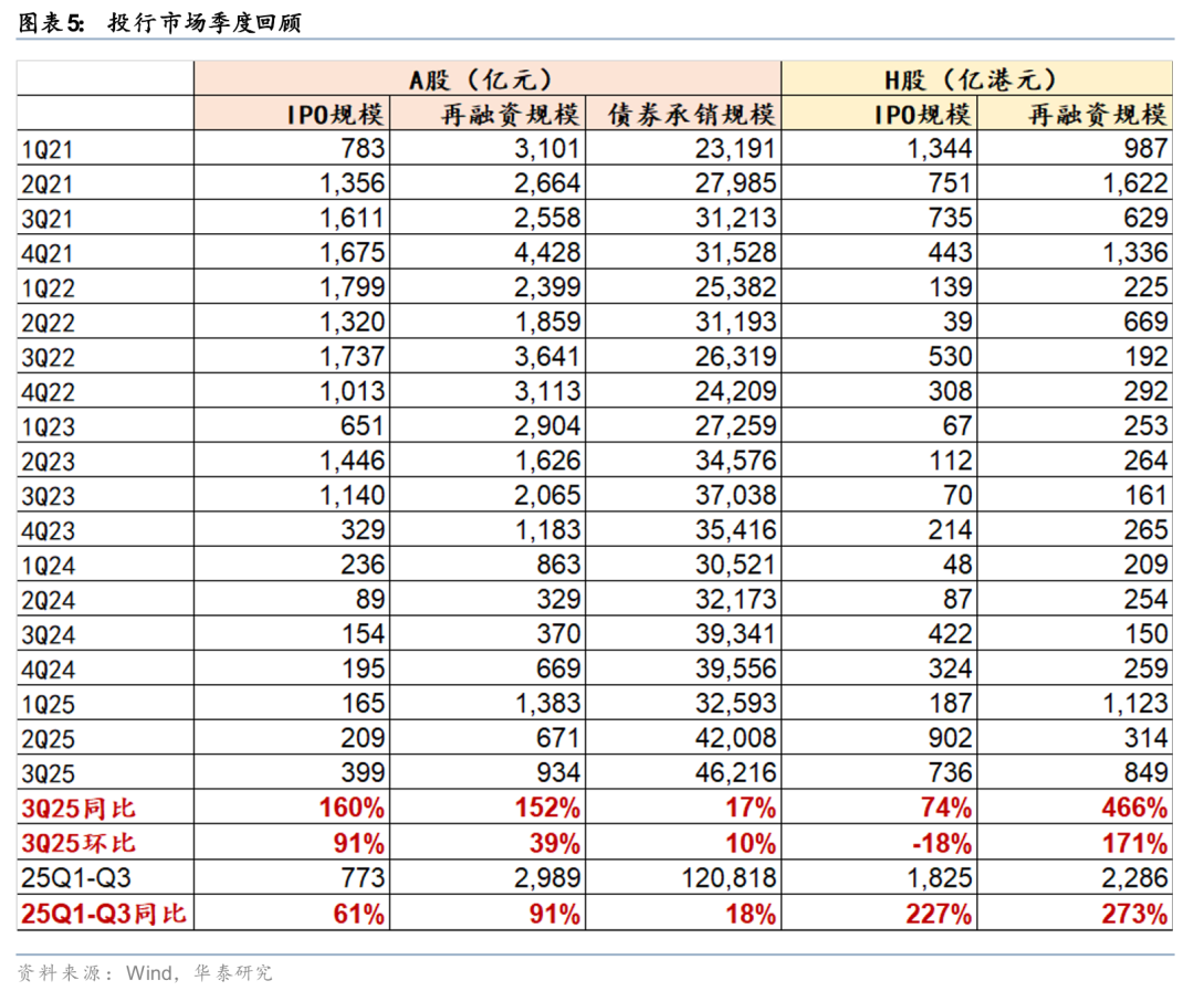 投行市场较去年显著回暖。2025年前三季度A股IPO、再融资规模分别达773亿元和2,989亿元(剔除四大行定增扰动),同比增长61%和91%,其中Q3单季度同比+160%、+152%;券商债券承销规模稳步增长,前三季度同比+18%,Q3单季度同比+17%。同时,港股投行市场放量明显,前三季度H股IPO、再融资规模分别为1,825亿港元和2,286亿港元,较去年同比大幅增长227%和273%,景气度显著修复。其中Q3单季度IPO、再融资规模分别为736、849亿港元,同比+74%、+466%。