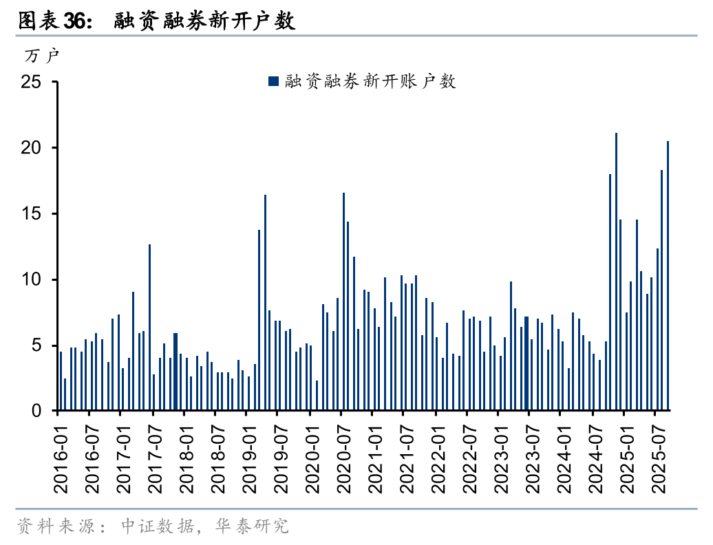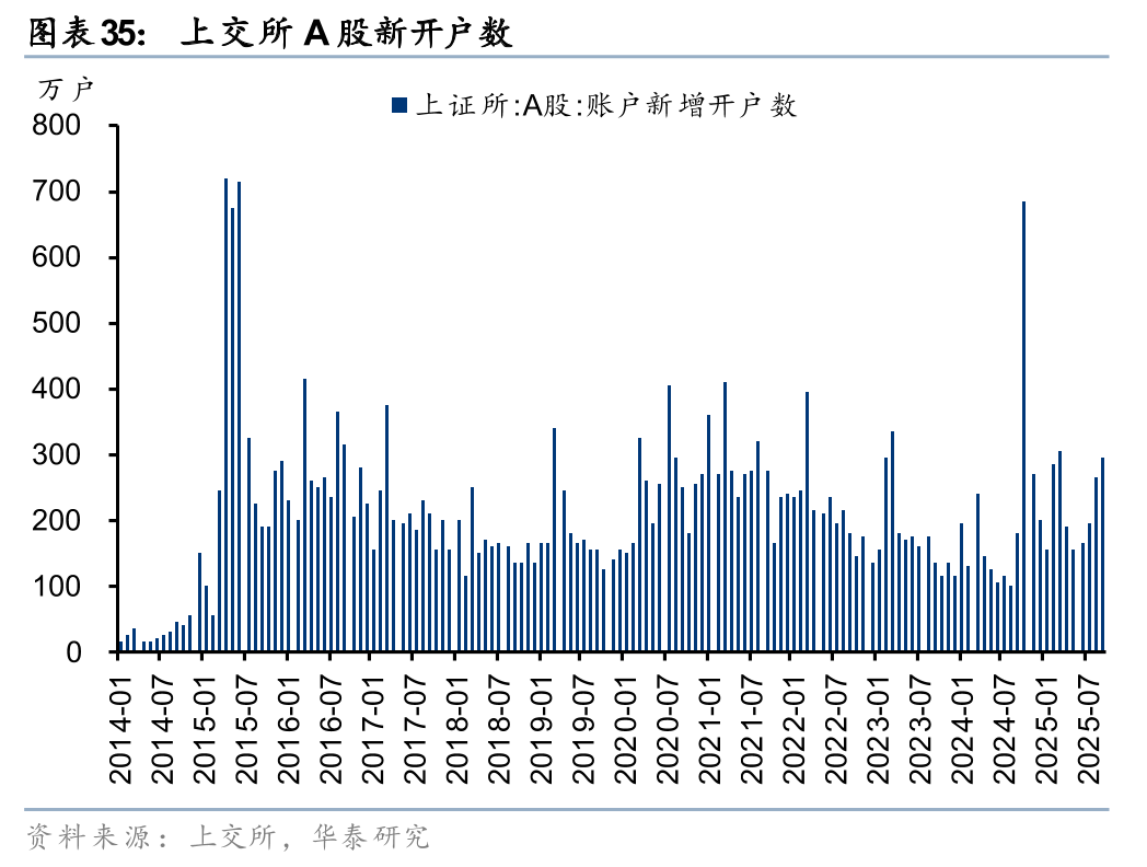 新开户数据强劲,交投活跃度有望延续,大财富业务趋势上行。增量资金仍在持续入场,5月以来A股和两融单月新开户数持续提升,呈现温和上涨态势。据上交所和中证数据披露,9月A股和融资融券新开户数分别为294万户、20.5万户,同比+61%、+288%,环比+11%、+12%。年初以来A股和融资融券新开户数持续强劲,2025年前9月分别累计新开2015万户、112万户,同比增长50%、138%。A股交易活跃且持续性增强,2万亿日成交额有望成为常态,同时融资余额连创历史新高,大财富业务趋势上行。