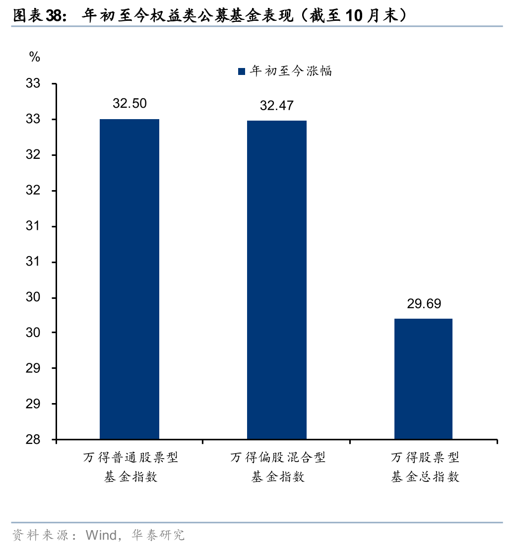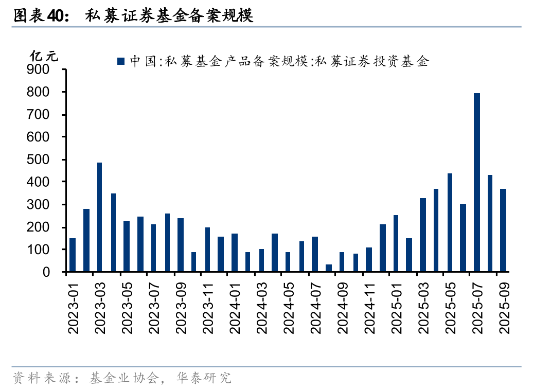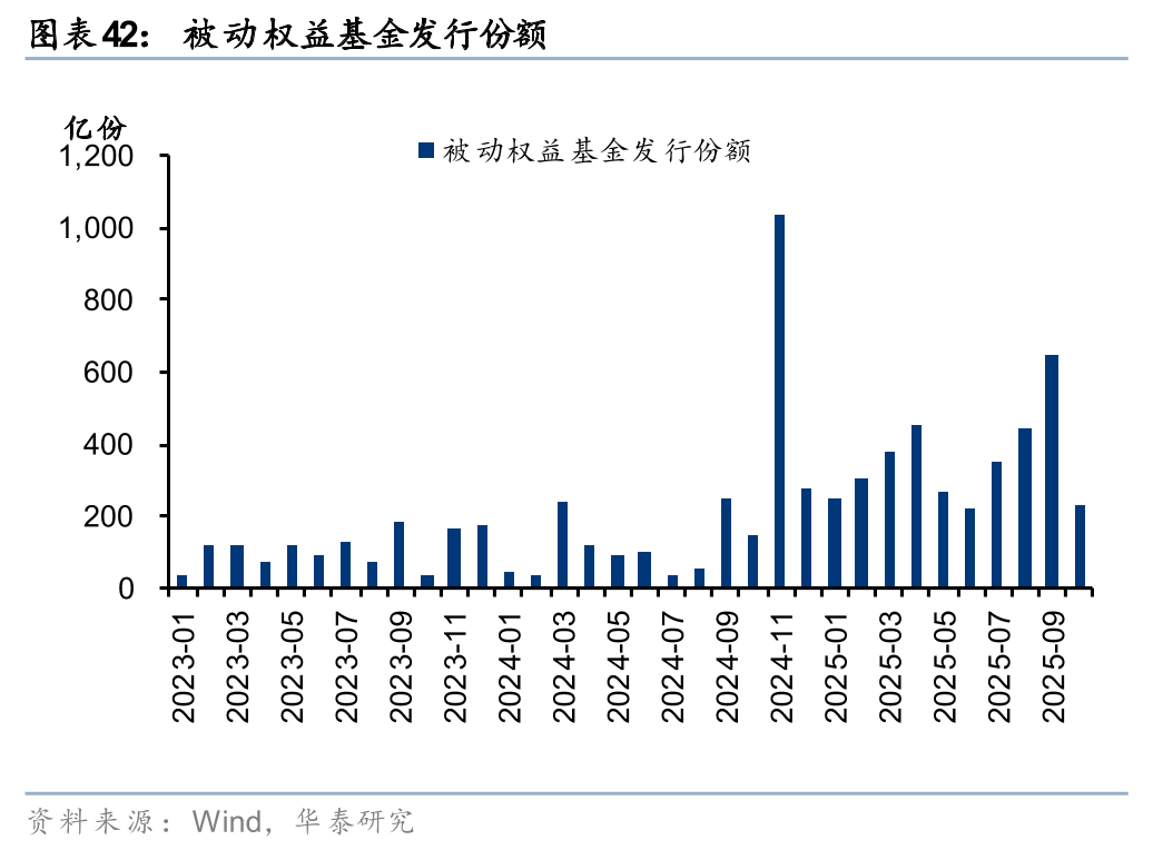权益类产品收益亮眼,私募、公募代销回暖,投顾业务探索纳入ETF。年初以来私募产品收益率表现亮眼,据私募排排网统计,前三季度量化多头和主观多头产品收益率分别为35.76%和32.15%。亮眼的业绩驱动私募产品备案热度持续提升,今年1-9月私募证券基金备案规模合计3431亿元,同比大幅增长234%,其中7月单月备案规模接近800亿元。截至9月末,私募证券基金存续规模已达5.97万亿元,较年初提升14%。公募方面,年初至10月末Wind股票型基金指数涨29.69%,基金新发份额稳步修复。1-10月主动权益基金和被动权益基金分别发行1221亿份、3526亿份,同比+118%、+220%。同时,2025年6月证监会发布的《关于在科创板设置科创成长层 增强制度包容性适应性的意见》提出“将科创板ETF纳入基金投顾配置范围”,预计投顾业务底层资产将进一步扩大至ETF。