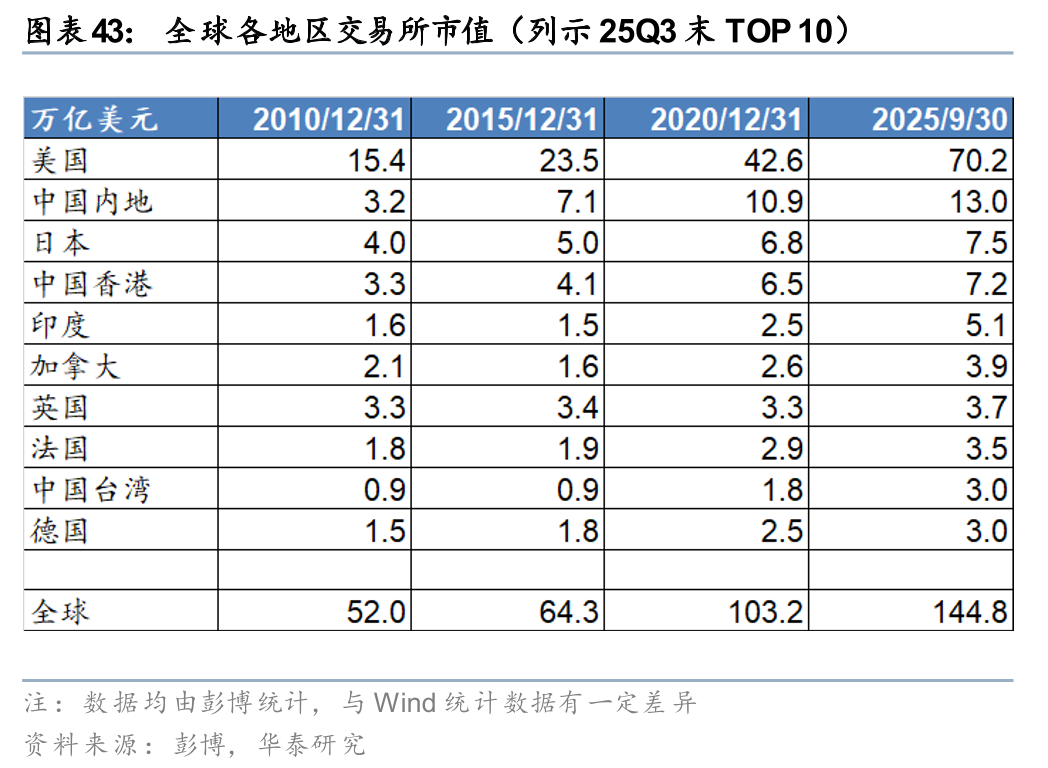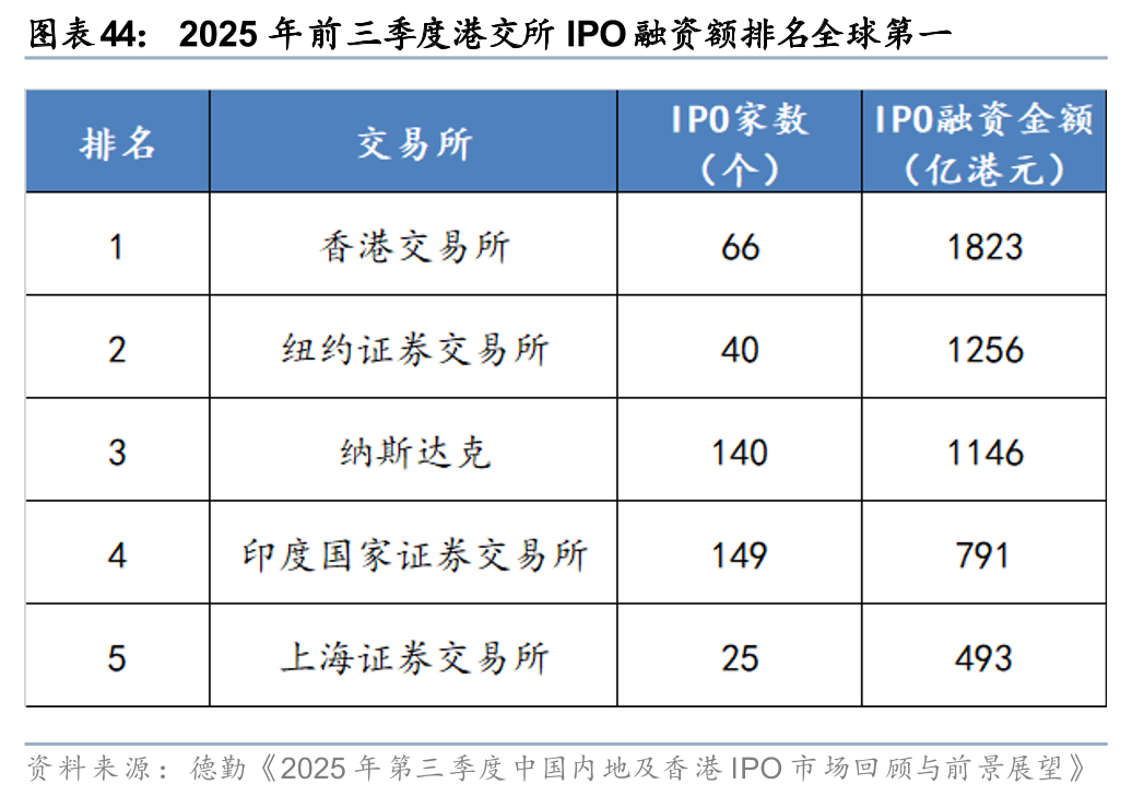 国际业务以香港为桥头堡,受益于香港资本市场制度优势和规模提升。在国际业务的扩张路径上,中资券商整体遵循“由近到远”、“由易到难”的路径,多将首站选在香港,通过设立香港子公司开展国际业务。香港市场拥有独特的制度优势,如IPO审核条件更包容、配售可采用“先旧后新”机制提高再融资效率、采取与国际发达市场相同的T+0交易机制等。且近年来,香港资本市场制度优势仍在不断加强,如2024年引入库存股机制,2025年推出“科企专线”,允许以保密形式递表等。在此背景下,香港市场成为优质资产上市的首选市场之一,2025年前三季度港交所IPO融资额排名全球第一(据德勤统计);香港市场规模持续扩大,Q3末港交所总市值排名全球第四(据彭博数据)。