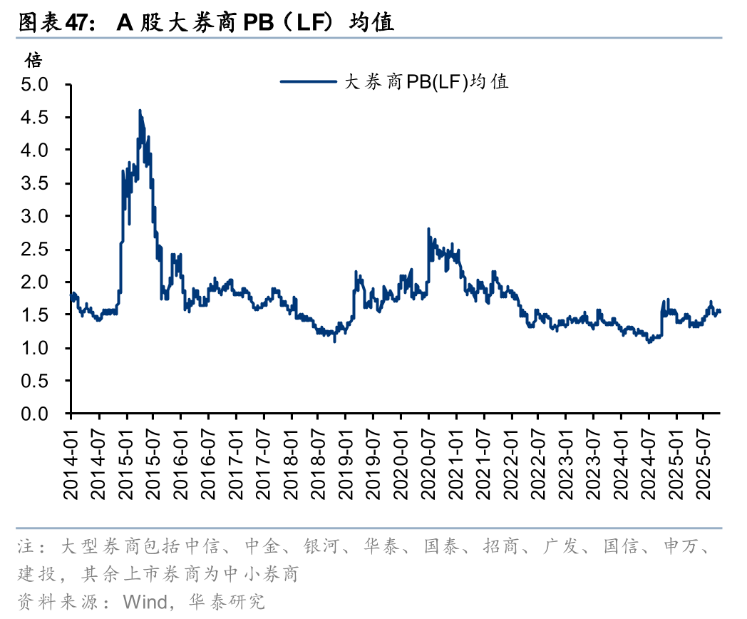 经纪、投资、利息弹性延续,投行低位修复,资管保持稳健。从业务结构看,25Q1-Q3大型券商收入结构较为稳定,投资和经纪为主要贡献,收入占比分别为51%和27%。从同比变化看,25Q1-Q3大券商基金、投资、利息净收入均实现显著增长,同比+78%、+41%、+92%,弹性延续;投行净收入同比+32%,持续从低位修复;资管保持平稳,净收入同比小幅增长8%。