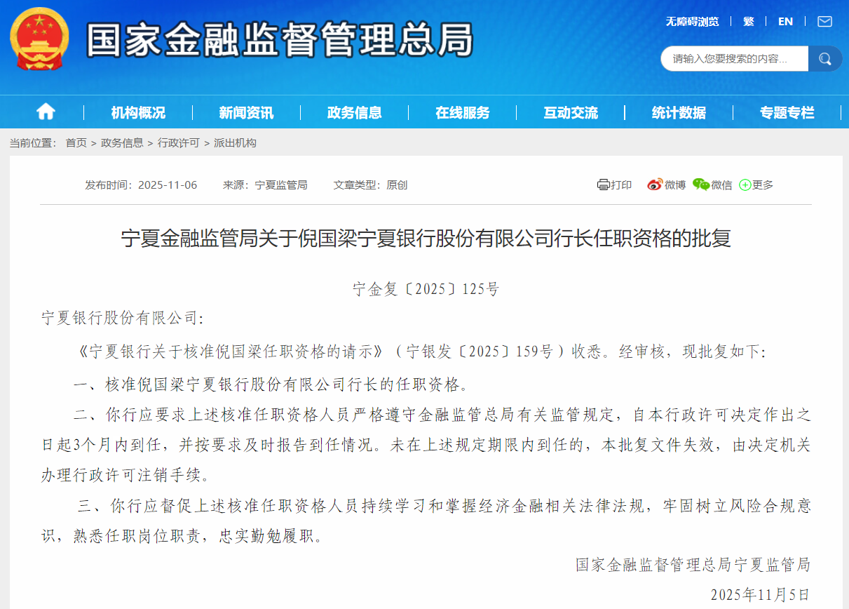 国家金融监督管理总局宁夏监管局于11月5日正式发布《关于倪国梁宁夏银行股份有限公司行长任职资格的批复》(宁金复〔2025〕125号),核准倪国梁担任宁夏银行行长一职,标志着这家区域龙头城商行的高层人事调整正式收官。根据批复要求,倪国梁需在行政许可决定作出之日起3个月内到任,履职期间需持续强化风险合规意识,忠实勤勉履行岗位职责。