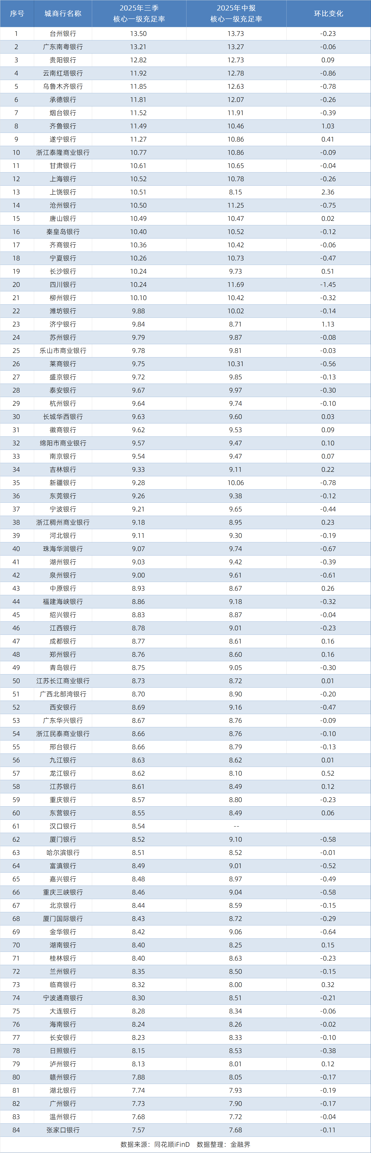从已披露的数据来看,84家城商行中,台州银行以13.50%的核心一级充足率位居首位;广东南粤银行、贵阳银行紧随其后,分别达13.21%、12.82%,三家银行均保持12%以上的较高资本水平。