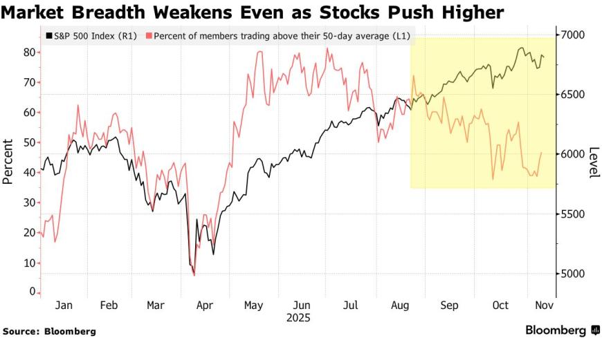 分析师们已对市场广度收窄发出警告——当前行情仅惠及少数与AI相关的科技巨头,若这一投资主题崩塌,更广泛的指数将面临风险。数据显示,尽管标普500指数自7月初以来上涨近10%,但该指数成分股中交易价格高于50日移动平均线的个股不足半数,较7月初超过80%的比例显著下降。投资者对估值高企也一直保持警惕。标普500指数的预期市盈率为22.7倍,高于18.8倍的10年均值。