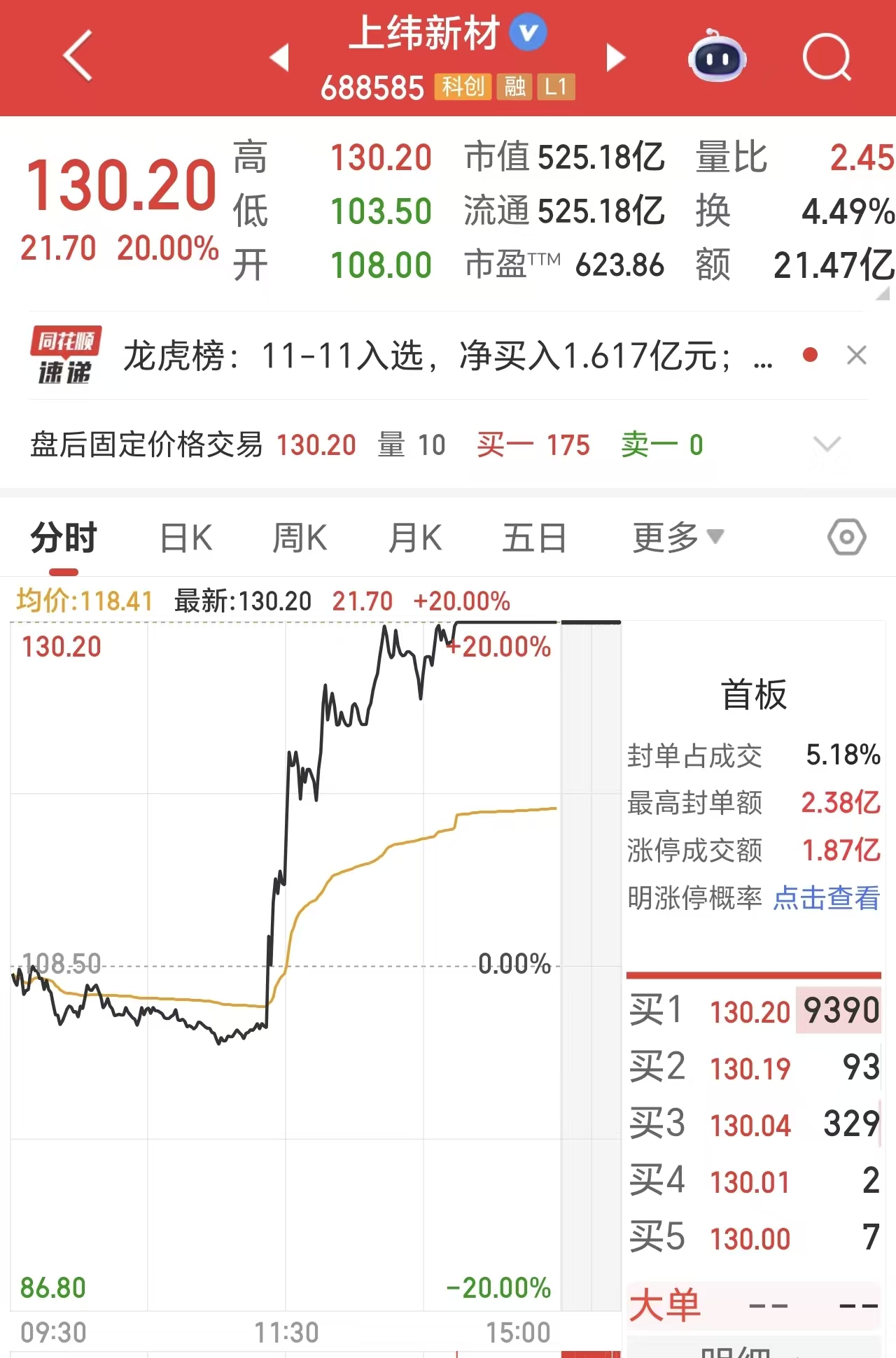 受该消息影响,上纬新材11日尾盘强势涨停,报收130.20元/股,市值为525.18亿元。