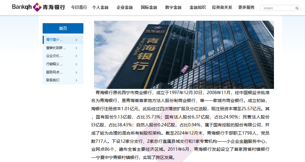 官网信息显示,青海银行原名西宁市商业银行,成立于1997年12月30日,2008年11月更名为青海银行,是青海省首家地方法人股份制商业银行、唯一一家城市商业银行。成立初始,青海银行注册资本1.01亿元,此后经过四次增资扩股及分红送股,现注册资本增至25.57亿元。其中,国有股份9.13亿股,占比35.73%;国有法人股份6.37亿股,占比24.90%;民营法人股份9.83亿股,占比38.43%;自然人股份0.24亿股,占比0.94%,属于国有控股的股份有限公司。