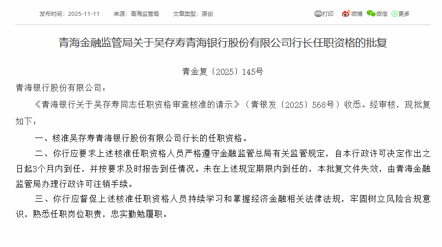 批复显示,青海银行应要求上述核准任职资格人员严格遵守金融监管总局有关监管规定,自行政许可决定作出之日起3个月内到任,并按要求及时报告到任情况。未在上述规定期限内到任的,批复文件失效,由青海金融监管局办理行政许可注销手续。